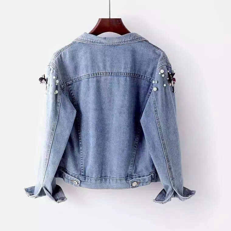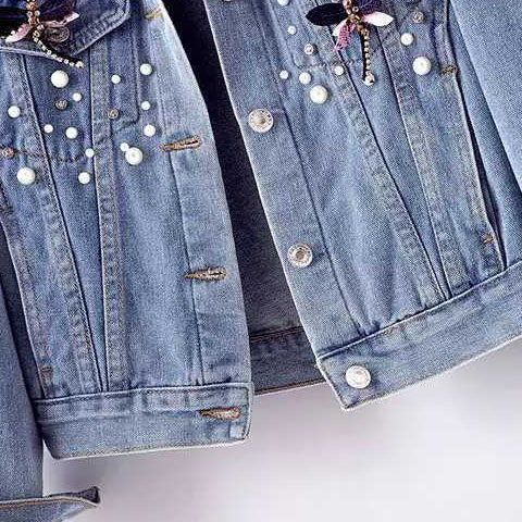 Die Jeansjacke ist mit dekorativen Beschlägen verziert
