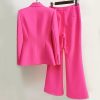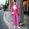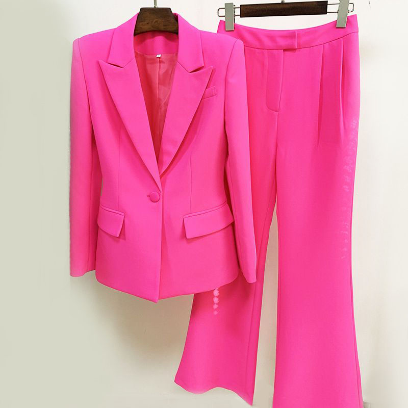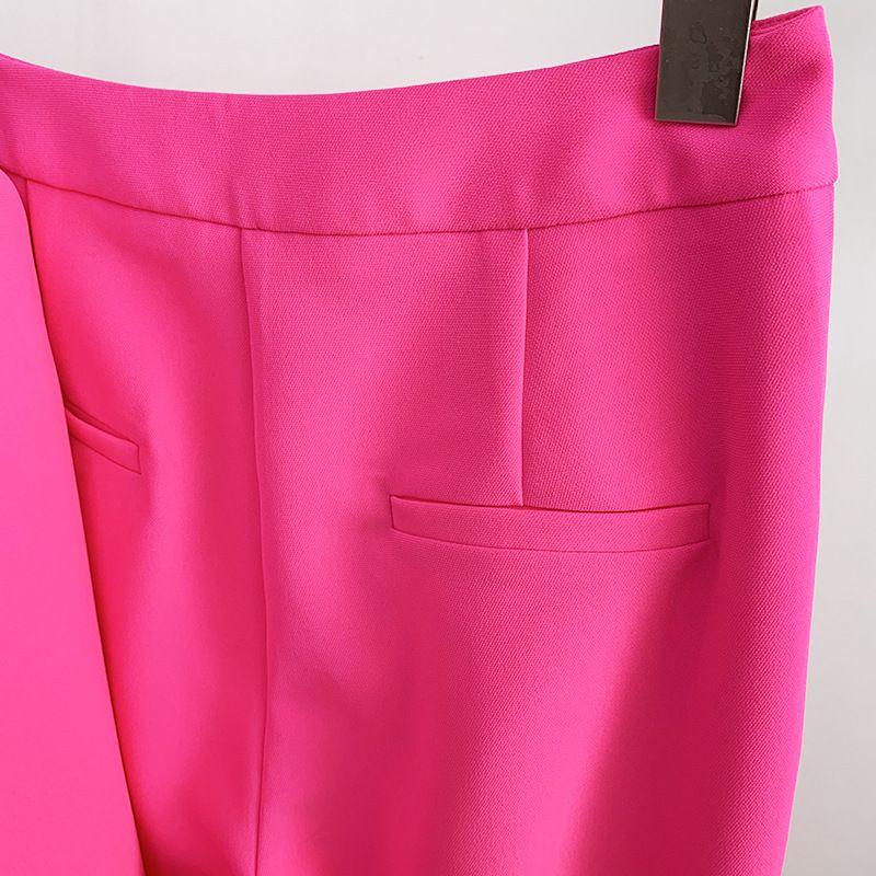 Der Hosenanzug in leuchtendem Rosa ist eine mutige und stilvolle Wahl, die garantiert Aufmerksamkeit erregt und dem Look lebendigen Glanz verleiht. Der leuchtende Rosaton vermittelt Selbstbewusstsein und Weiblichkeit, während der klassische Schnitt des Anzugs Eleganz und Raffinesse bewahrt. Dieser Anzug eignet sich perfekt für Abendveranstaltungen, geschäftliche Treffen oder besondere Anlässe und setzt einen lebendigen Akzent in jedem Outfit.