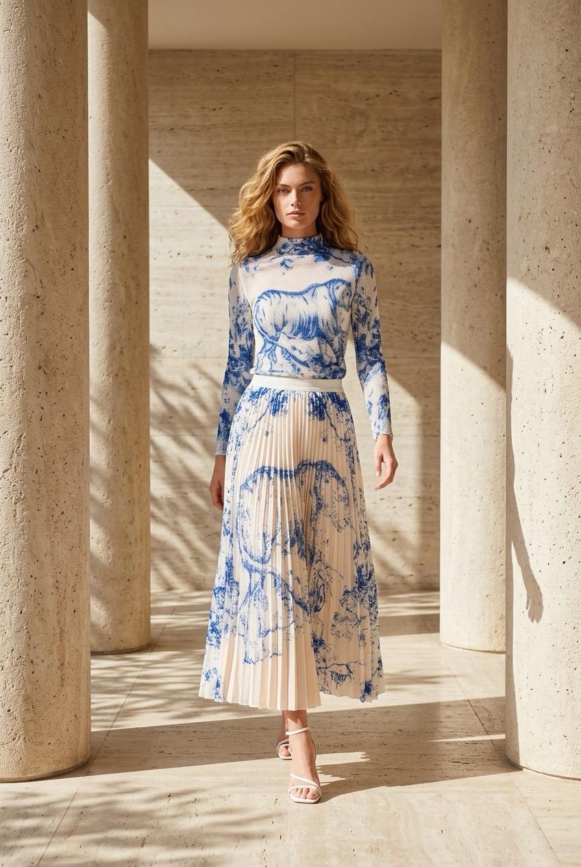 Dieser elegante weiße Anzug ist mit einem stilvollen blauen Muster versehen, das dem Outfit eine moderne und frische Note verleiht. Der Kontrast zwischen dem weißen Grundton und dem blauen Muster sorgt für einen auffälligen visuellen Effekt und verleiht dem Anzug einen einzigartigen Look. Der Anzug besteht aus hochwertigem, angenehmem Material, das für hohen Tragekomfort sorgt. Perfekt für besondere Anlässe oder um ein modisches Statement zu setzen, lässt sich dieser Anzug sowohl elegant als auch lässig kombinieren.
