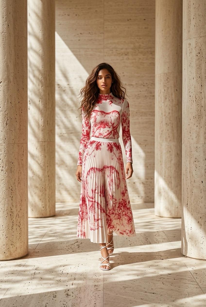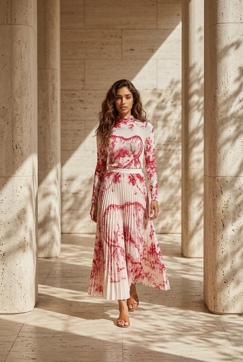 Dieser elegante weiße Anzug ist mit einem auffälligen roten Muster verziert, das dem Outfit eine lebendige und stilvolle Note verleiht. Der Kontrast zwischen dem weißen Grundton und dem roten Muster schafft einen besonderen visuellen Akzent und verleiht dem Anzug einen modernen Look. Der Anzug besteht aus hochwertigem, angenehm zu tragendem Material, das für optimalen Komfort sorgt. Ideal für besondere Anlässe oder für ein modisches Statement im Alltag, lässt sich dieser Anzug sowohl elegant als auch leger kombinieren.