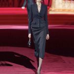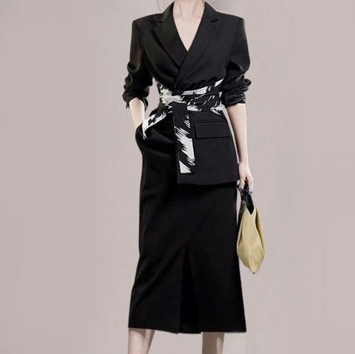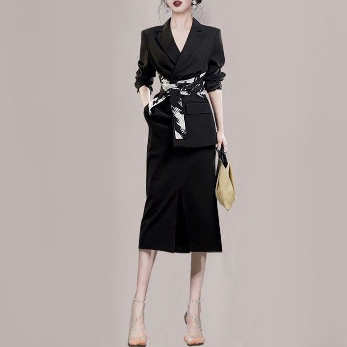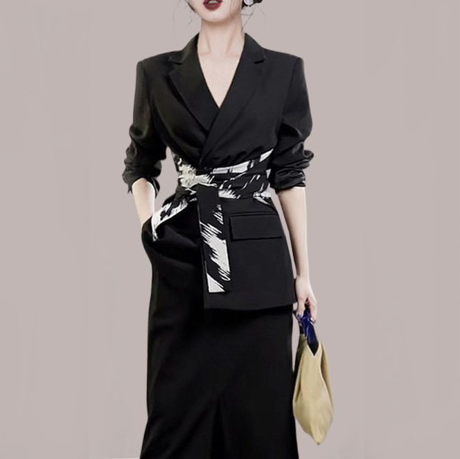 Klassischer, figurbetonter schwarzer Anzug mit einem breiten schwarz-weißen Gürtel