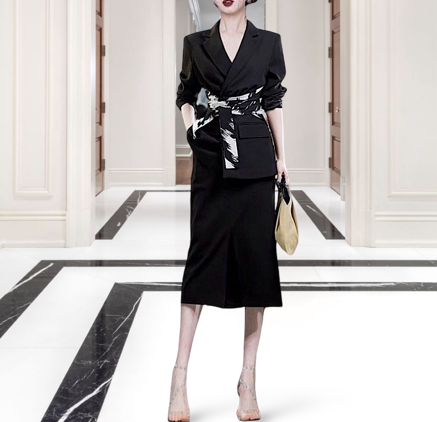 Ein klassischer, figurbetonter Anzug in Schwarz, ergänzt mit einem breiten schwarz-weißen Gürtel, sitzt perfekt und betont die Eleganz der Trägerin. Dieses stilvolle Ensemble vereint die Strenge des klassischen Stils mit einem modischen Akzent, der dem Outfit Individualität und Dynamik verleiht. Die Jacke mit präzisem Schnitt und die gerade geschnittene Hose bilden eine makellose Silhouette, die sowohl für geschäftliche Anlässe als auch für abendliche Veranstaltungen geeignet ist.