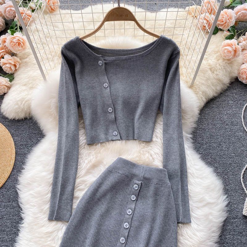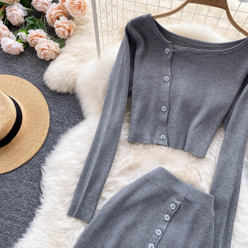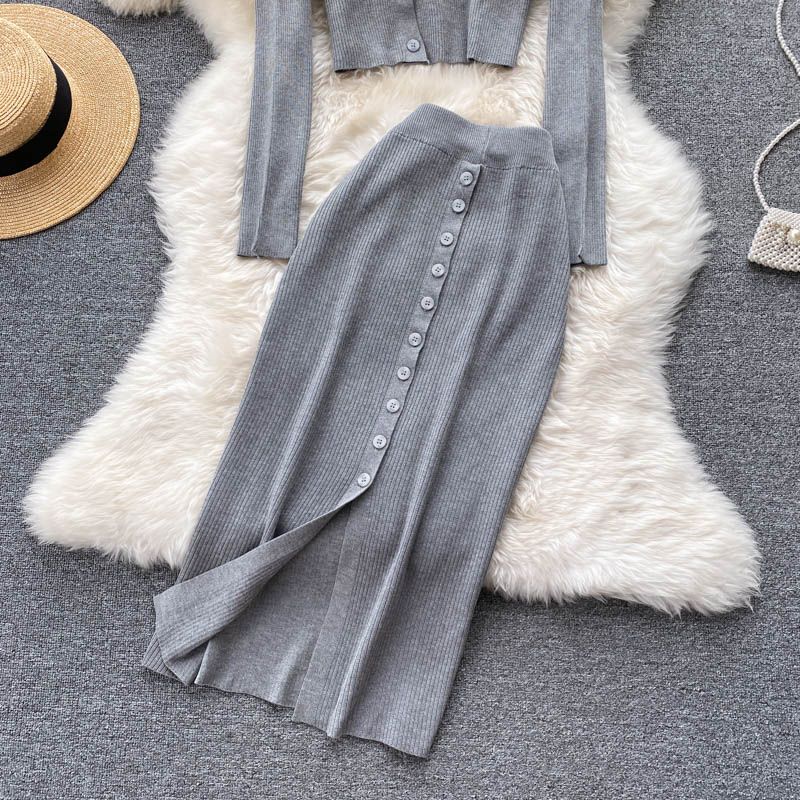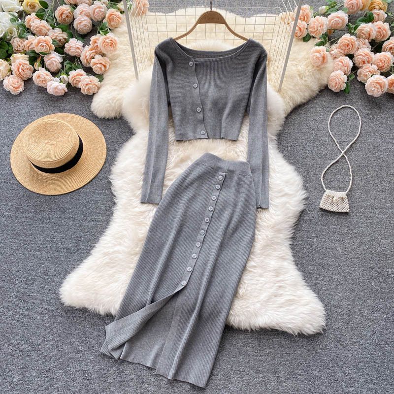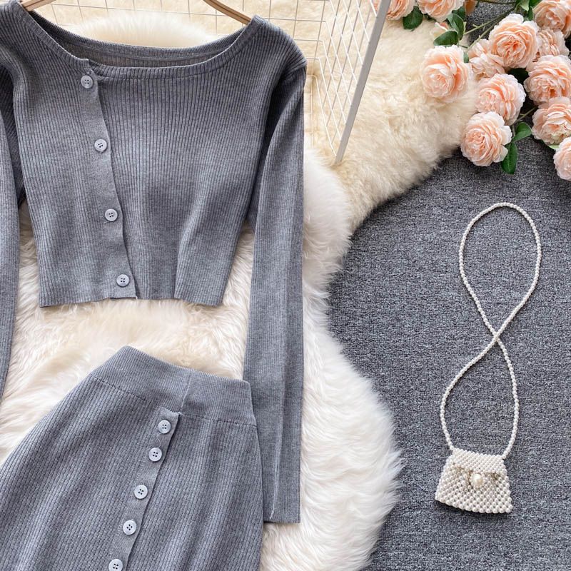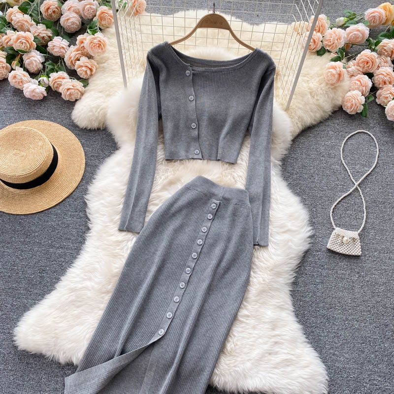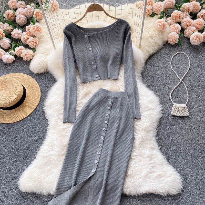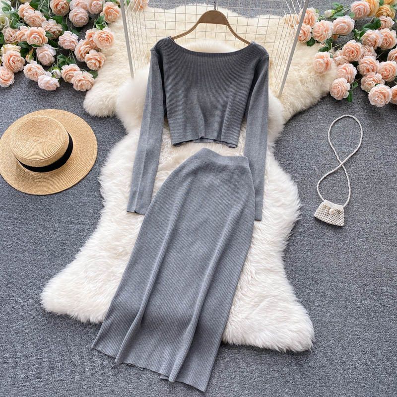 Grau gestrickter Anzug bestehend aus Top und Rock.