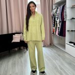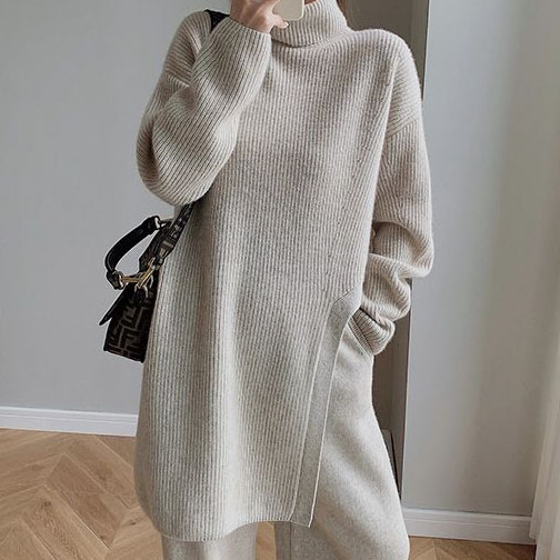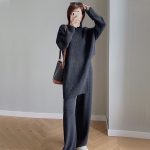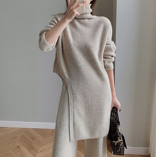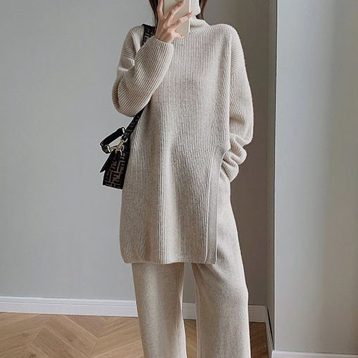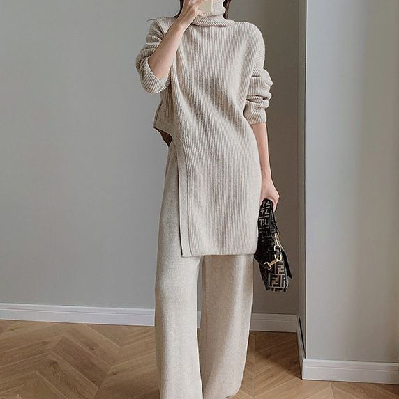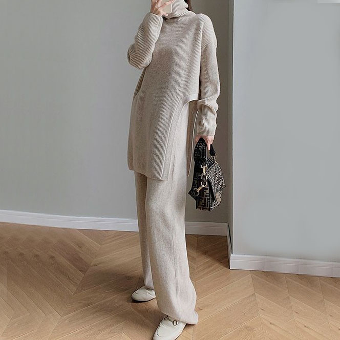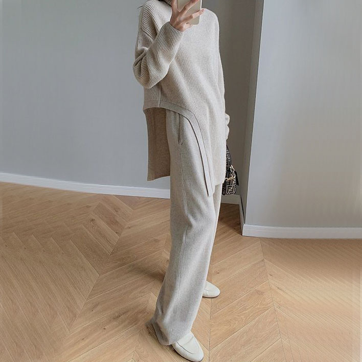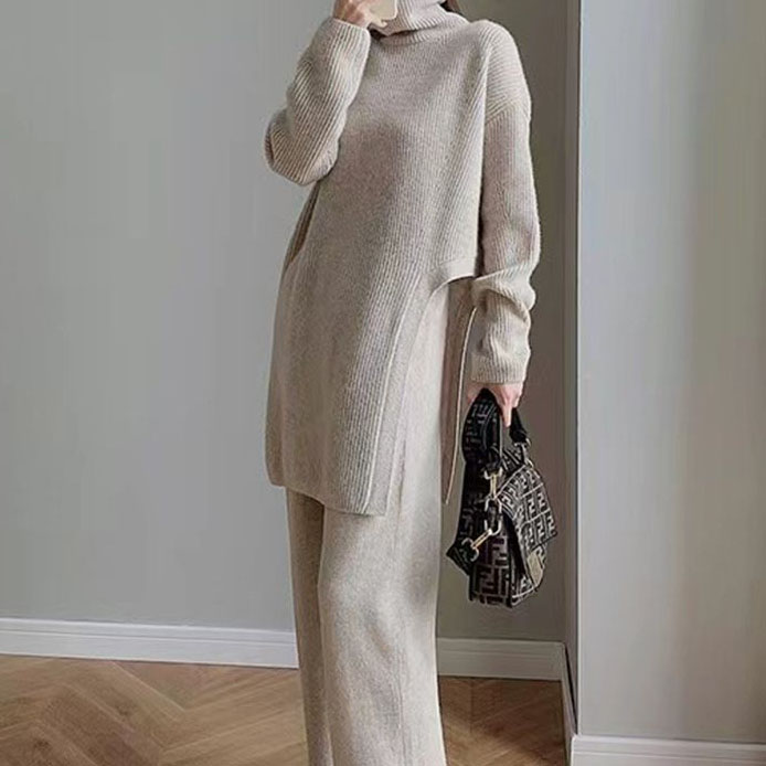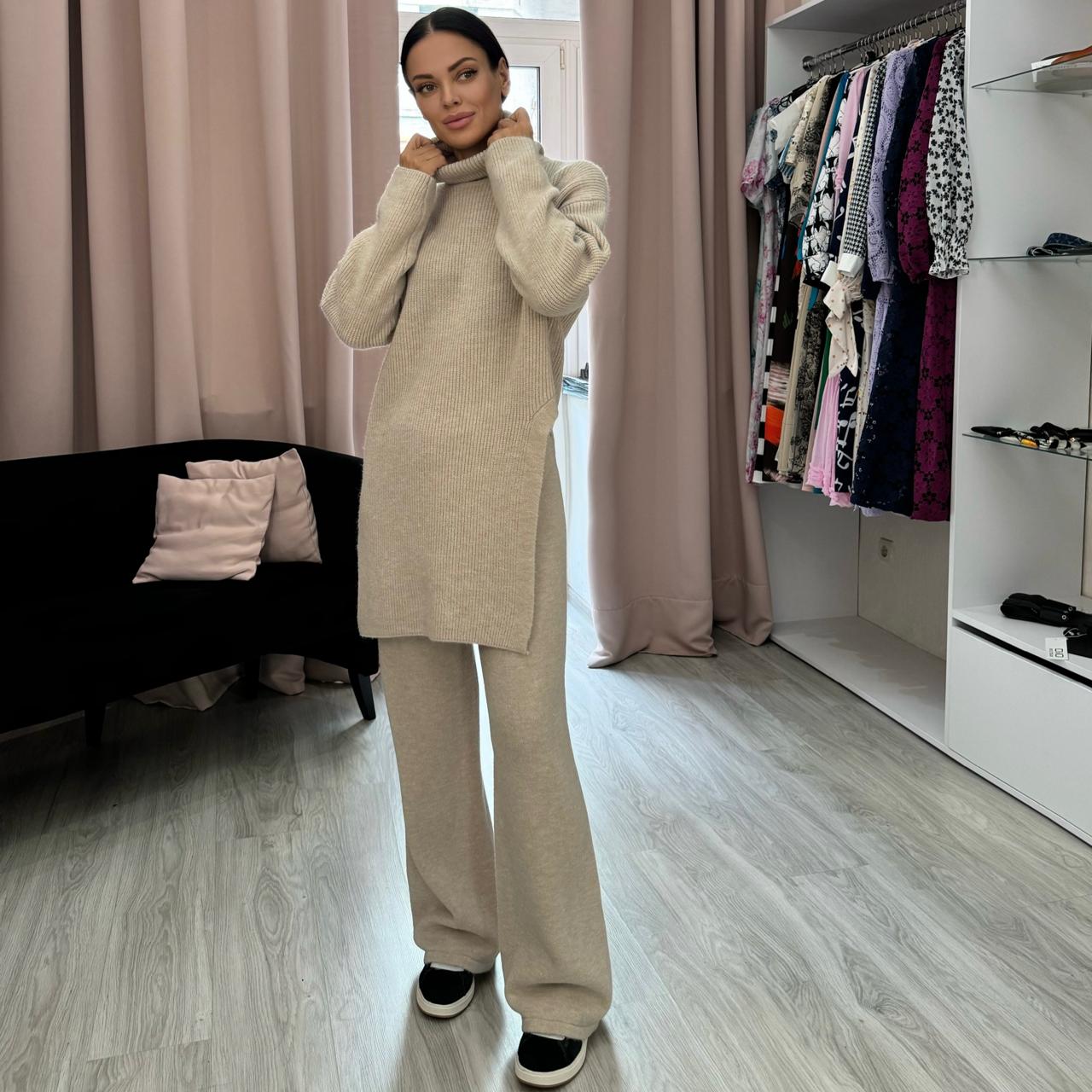 Ein beigefarbener Strickanzug mit asymmetrischem Pullover und weiten Hosen vereint Eleganz und Komfort. Der asymmetrische Schnitt des Pullovers verleiht dem Look eine stilvolle Dynamik und Moderne und zieht die Blicke auf sich. Die weiten Hosen runden das Set ab und schaffen eine entspannte und harmonische Silhouette. Dieses Set ist ideal für einen geschmackvollen und gemütlichen Alltagslook