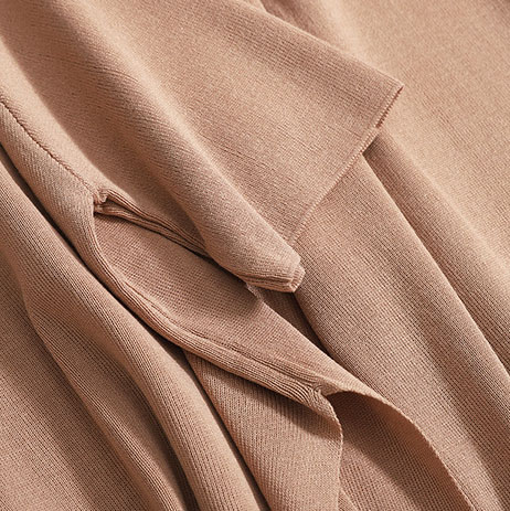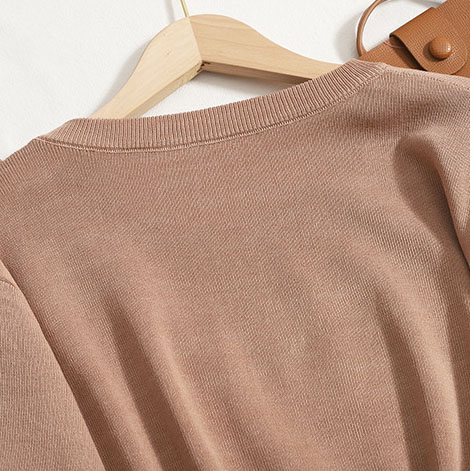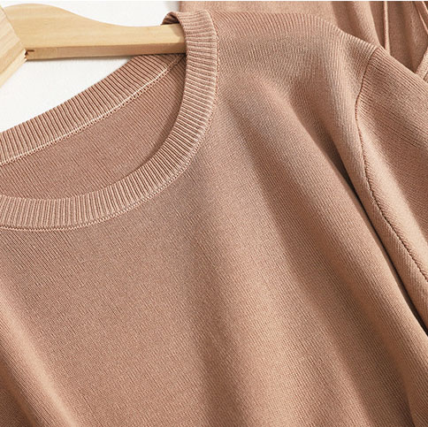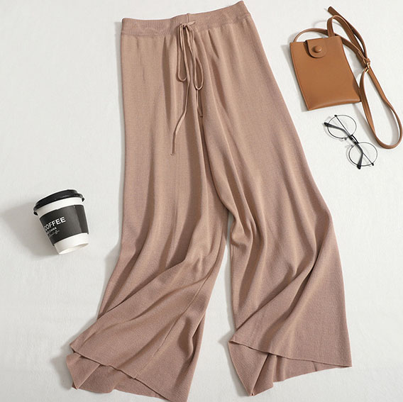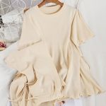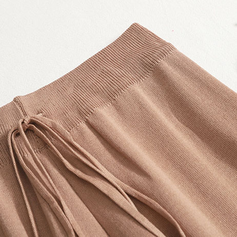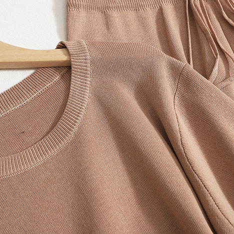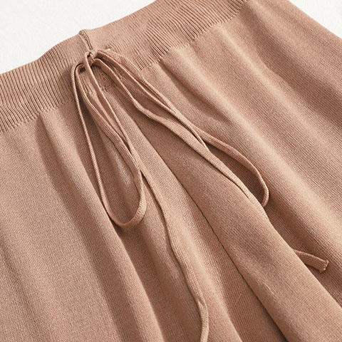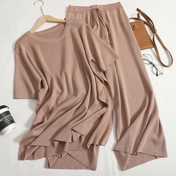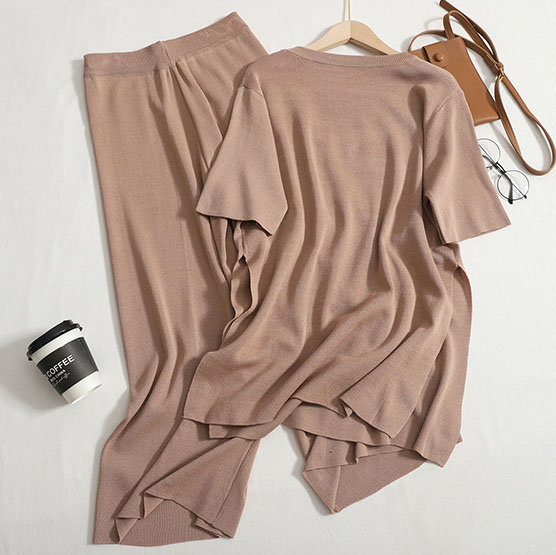Ein leichter мokkо Strickanzug, bestehend aus einem T-Shirt und weiten Culottes. Perfekt für einen lässigen und zugleich stilvollen Look, der Komfort und Eleganz vereint.