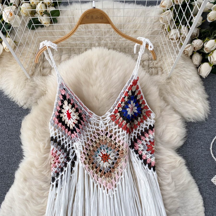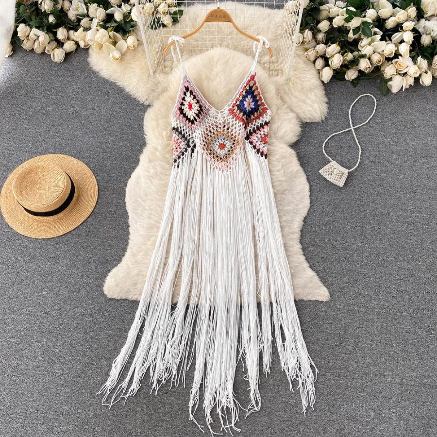 Leichte weiße Strandtunika aus Strick mit Fransen – die perfekte Wahl für warme Sommertage. Sie verleiht Ihrem Look Leichtigkeit und sorgt für einen entspannten, stilvollen Auftritt am Strand. Die Fransen setzen einen eleganten und trendigen Akzent und betonen die Einzigartigkeit des Modells. Sie passt perfekt zu einem Badeanzug und vervollständigt das ansprechende Outfit für den Strandurlaub.