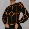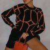 Dieser schwarze Pullover mit einem auffälligen orangefarbenen Muster ist ein modisches Statement. Das kräftige orange Muster setzt einen lebendigen Akzent auf dem schwarzen Hintergrund und verleiht dem Pullover eine besondere Note. Der Pullover ist aus weichem, bequemem Material gefertigt, das für angenehmen Tragekomfort sorgt. Perfekt für den Alltag oder für entspannte Ausflüge, lässt sich dieser Pullover sowohl mit Jeans als auch mit Hosen oder Röcken kombinieren und schafft einen modernen, trendigen Look.