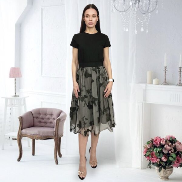 Der dunkle Rock mit Schmetterlingen ist ein stilvolles und originelles Kleidungsstück, das dem Outfit Farbe und Verspieltheit verleiht. Die Schmetterlinge auf dem Stoff schaffen ein auffälliges und zartes Muster, das sich perfekt für Alltagslooks oder leichte Sommeroutfits eignet. Die dunkle Farbe des Rocks macht ihn vielseitig und leicht kombinierbar mit verschiedenen Oberteilen und Accessoires, während er gleichzeitig Eleganz und Raffinesse bewahrt.