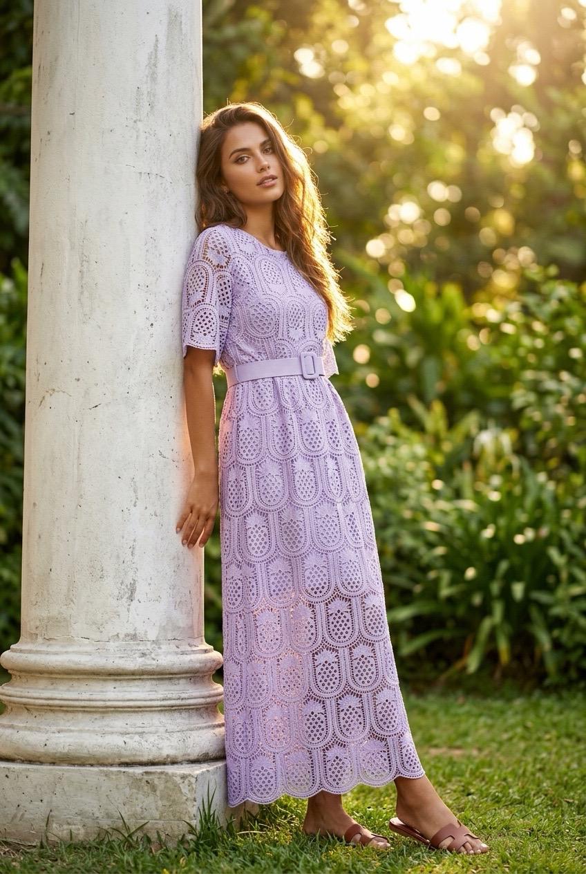 Dieses elegante Kleid in lavendelfarbenem Spitzenmaterial verleiht Ihrem Look eine zarte Eleganz. Die feine Spitzenstruktur und der sanfte Pastellton schaffen einen romantischen und femininen Stil. Das Kleid ist perfekt für besondere Anlässe, bei denen Sie raffiniert und edel aussehen möchten.