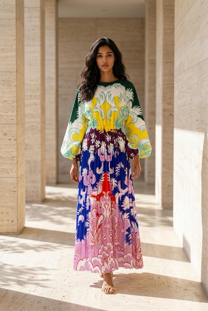 Das lange Kleid mit hellem Druck ist eine elegante und feminine Wahl für die warmen Monate. Der leichte und luftige Druck in hellen Tönen verleiht dem Kleid Frische und Romantik, während die lange Länge dem Outfit Eleganz und Raffinesse verleiht. Dieses Kleid eignet sich perfekt für Sommerpartys, Hochzeiten oder Abendspaziergänge und betont Schönheit und Grazie.