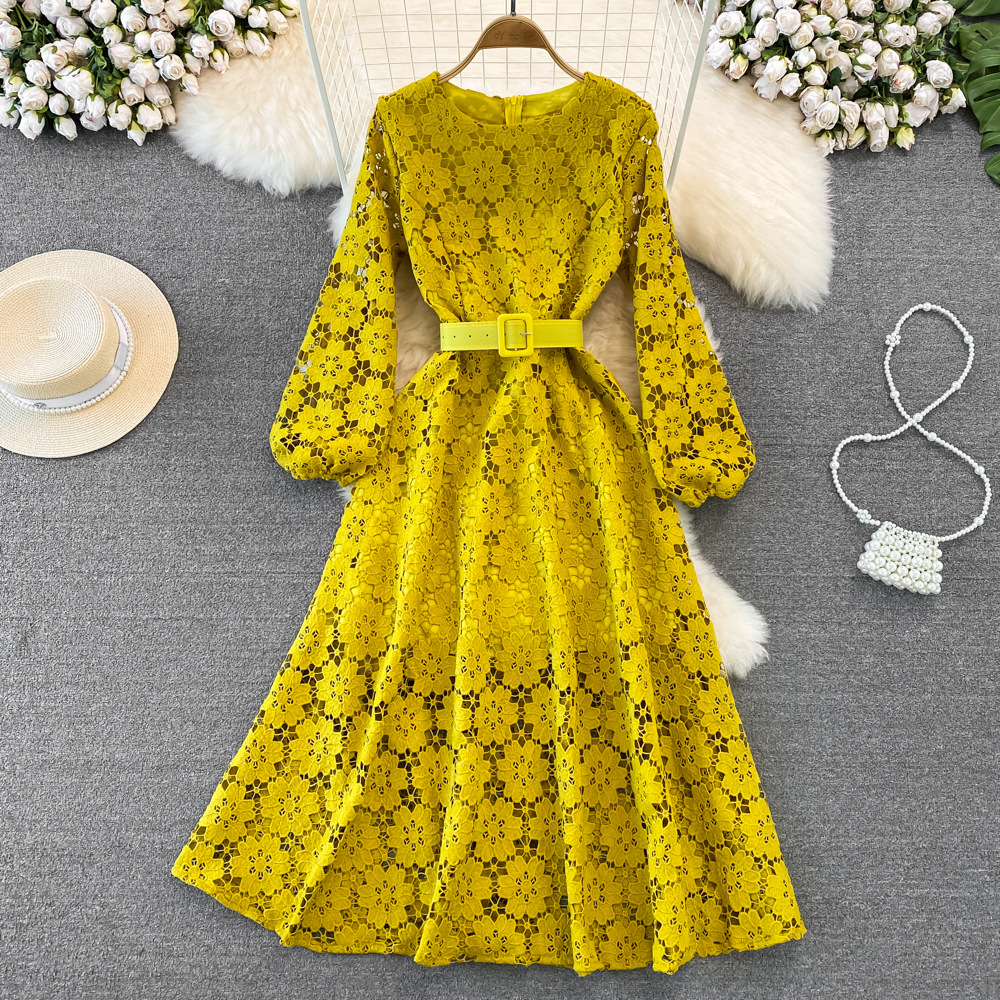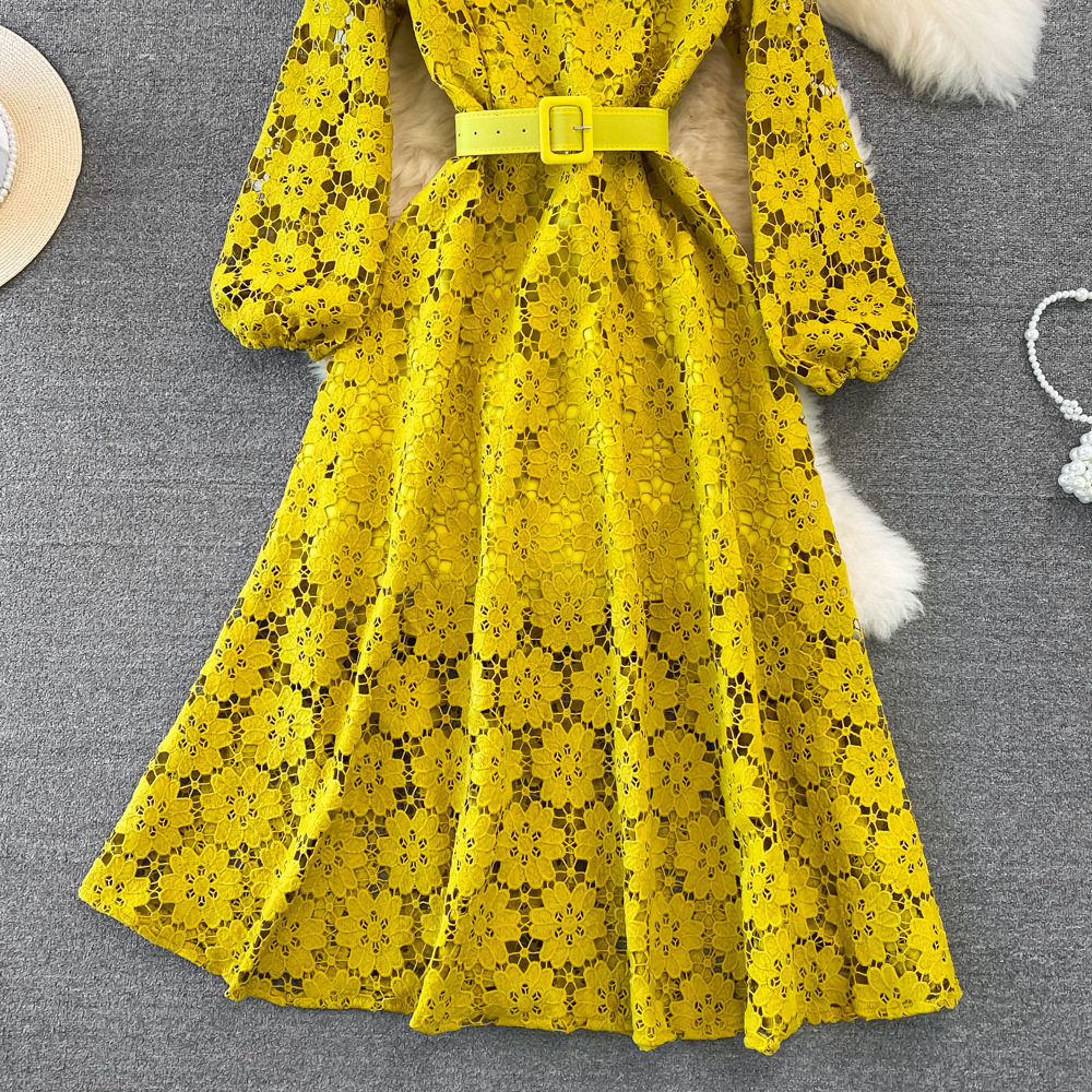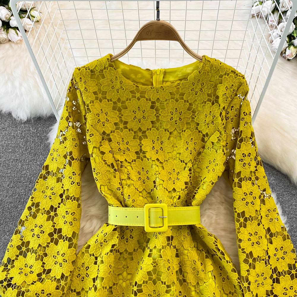 Kleid aus Spitze in senfgelb mit Gürtel.