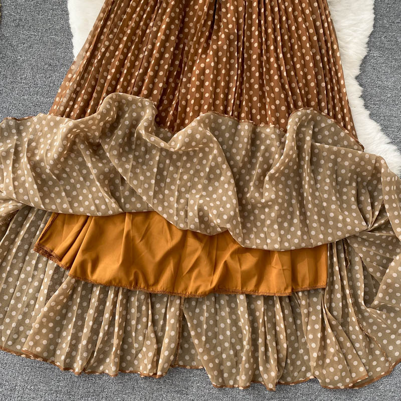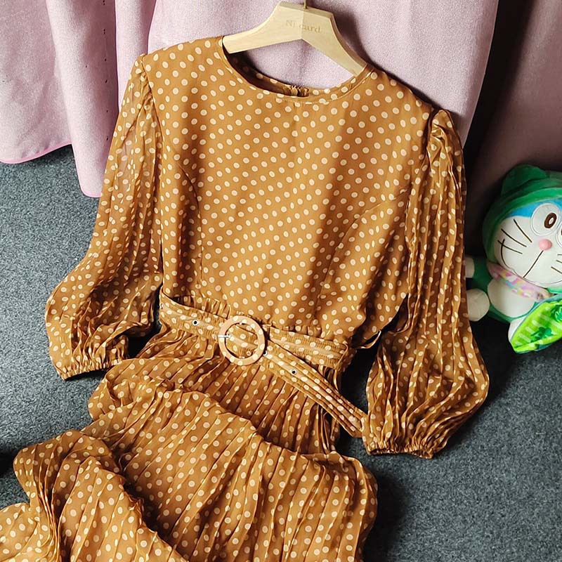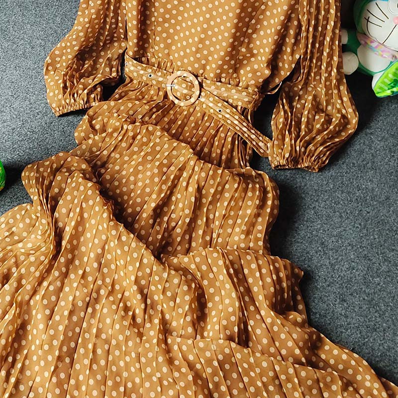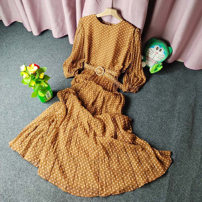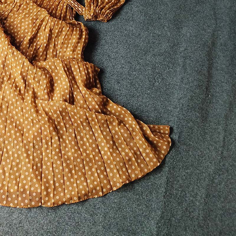 Ein Kleid aus feinem Krepp-Chiffon in Braun mit kleinem Punktmuster.