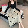 Midi-Kleid, schwarzer Oberteil, Rock mit Blumenmuster
