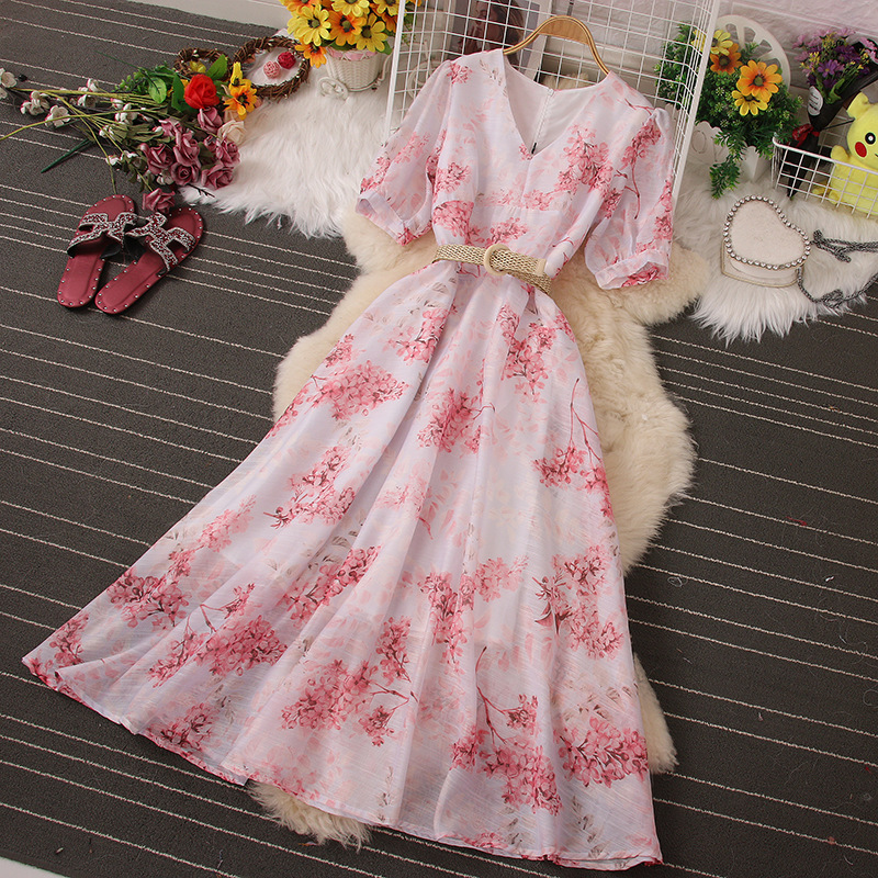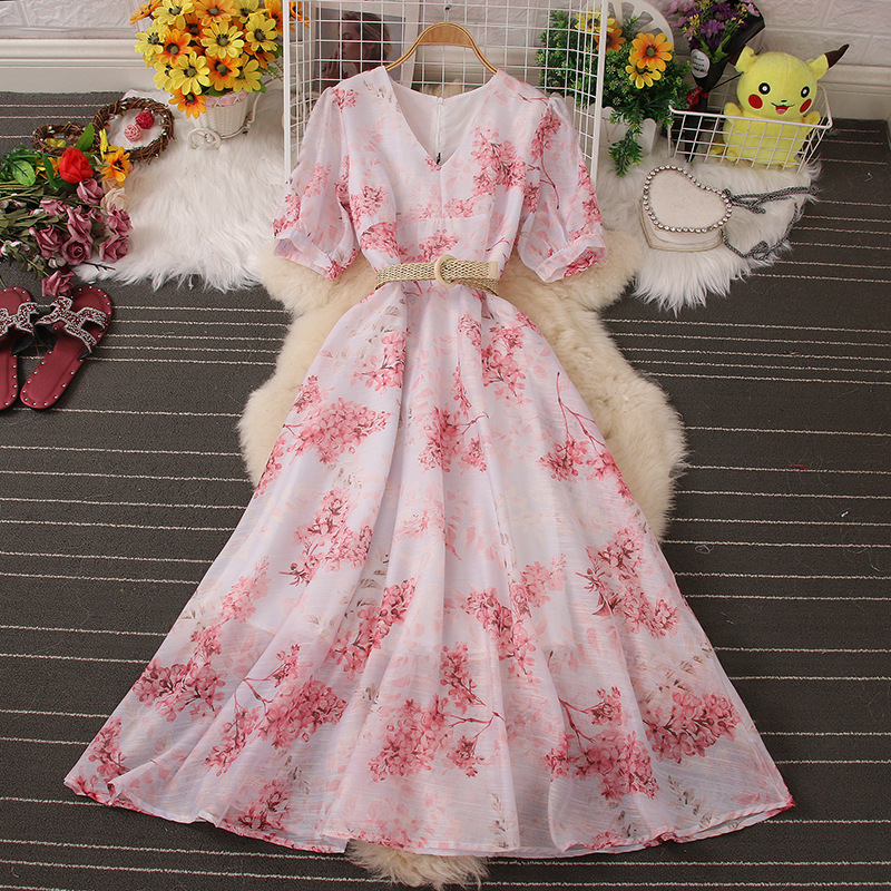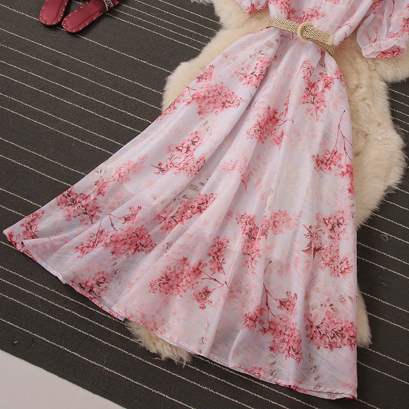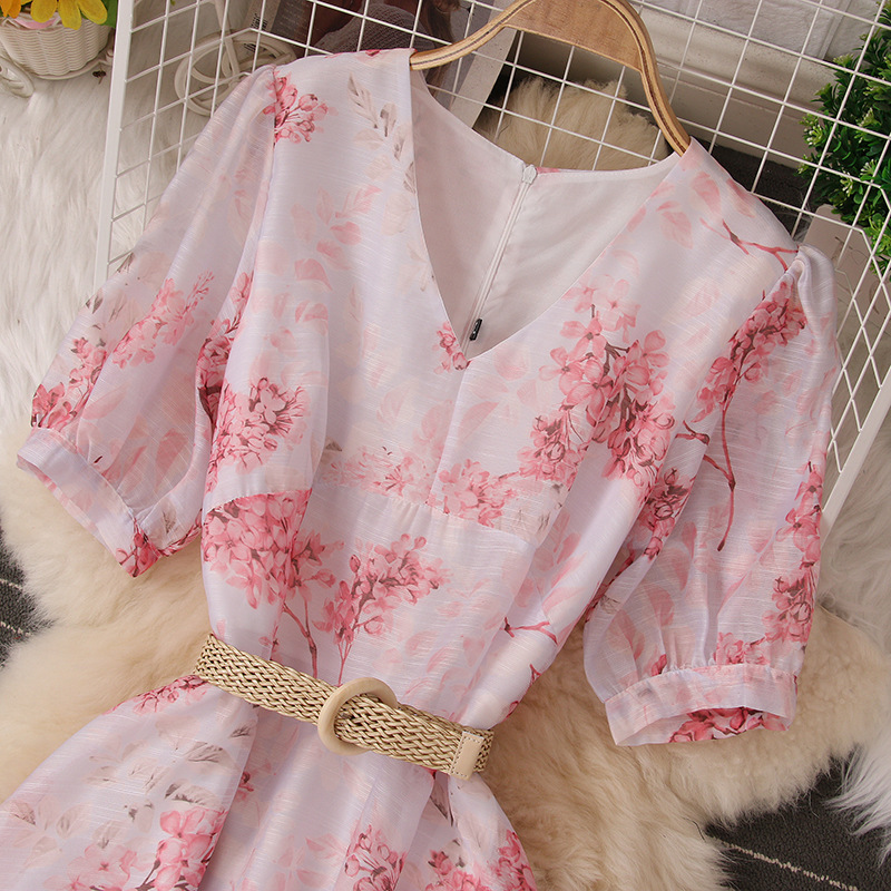 Midi-Kleid mit Gürtel im zartrosa Muster.
