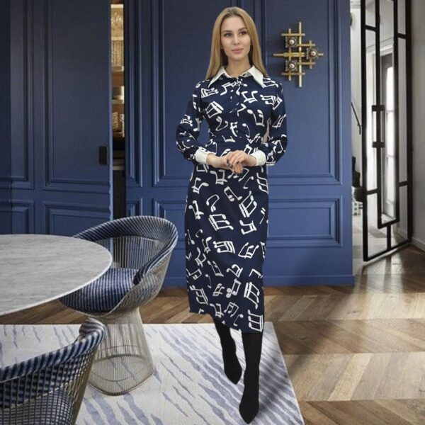 Elegantes Midikleid in Blau mit einem exquisiten Notenprint. Dieses stilvolle Kleid ist perfekt, um ein raffiniertes und musikalisch inspiriertes Outfit zu kreieren. Leicht und bequem, wird es Ihre Persönlichkeit unterstreichen und Ihnen Selbstbewusstsein bei jedem Anlass verleihen.