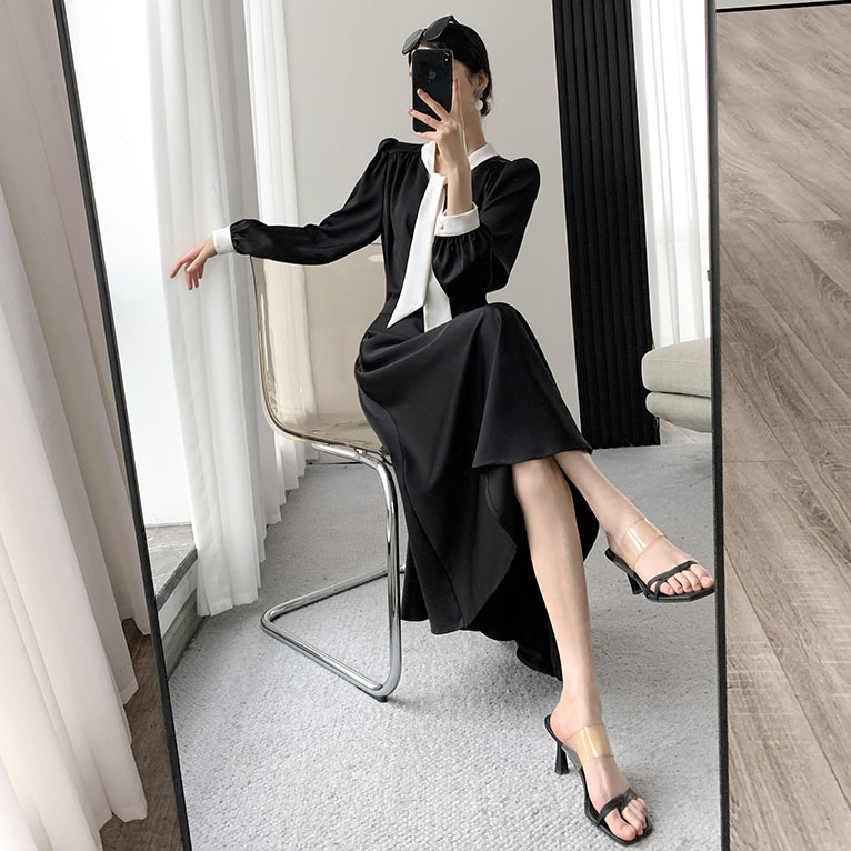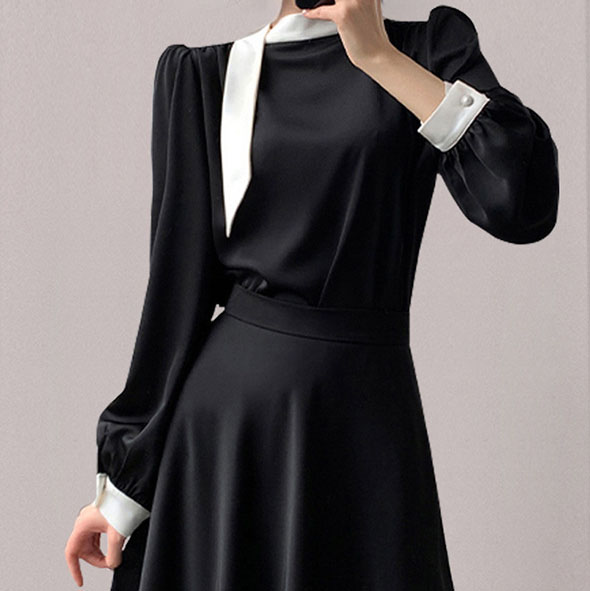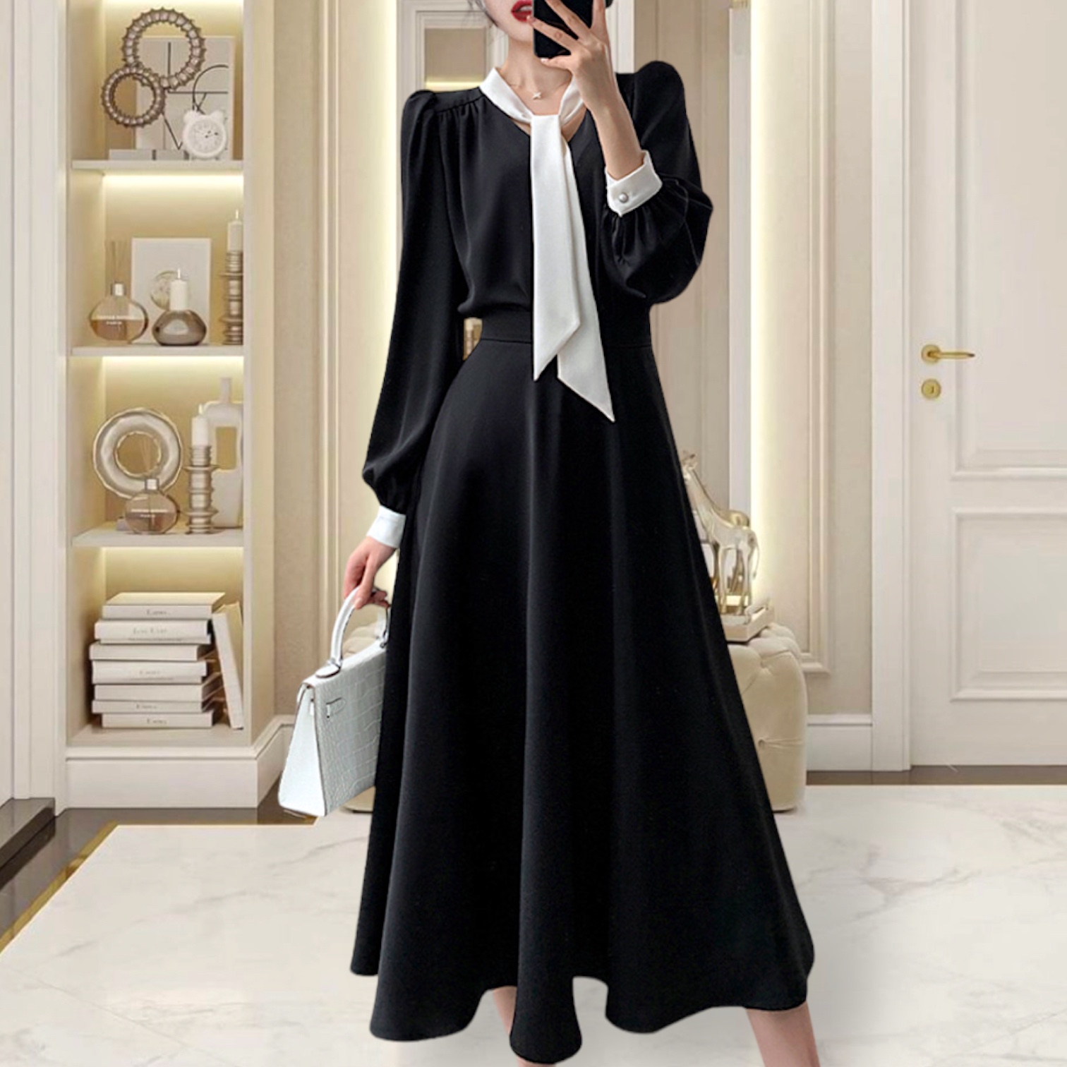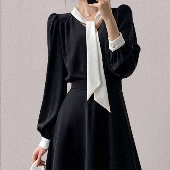 Kleid Midi in Schwarz mit weißem Kragen und Manschetten.