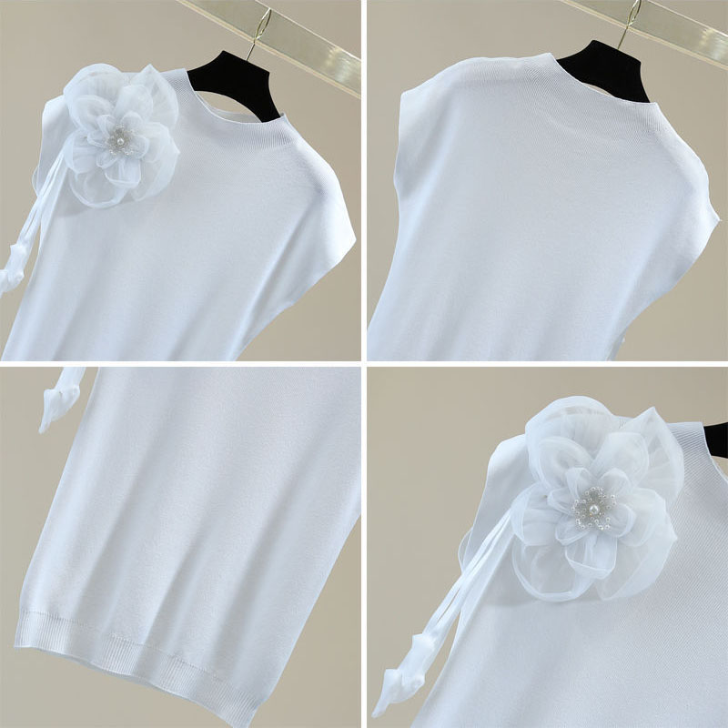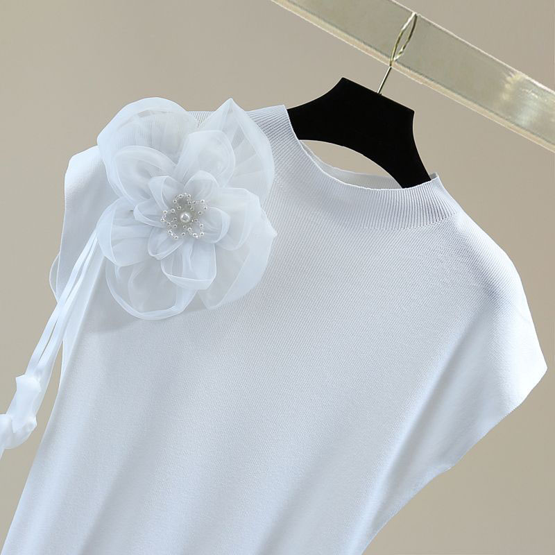 Dieses ärmellose weiße T-Shirt ist mit einer dekorativen schwarzen Blume verziert, die dem Kleidungsstück eine stilvolle und feminine Note verleiht. Die schwarze Blume setzt einen eleganten Akzent und macht das T-Shirt zu einem besonderen Blickfang. Der weiche, leichte Stoff sorgt für hohen Tragekomfort, besonders an warmen Tagen. Perfekt für einen modernen und eleganten Look, lässt sich dieses T-Shirt hervorragend mit Jeans, Röcken oder Shorts kombinieren.