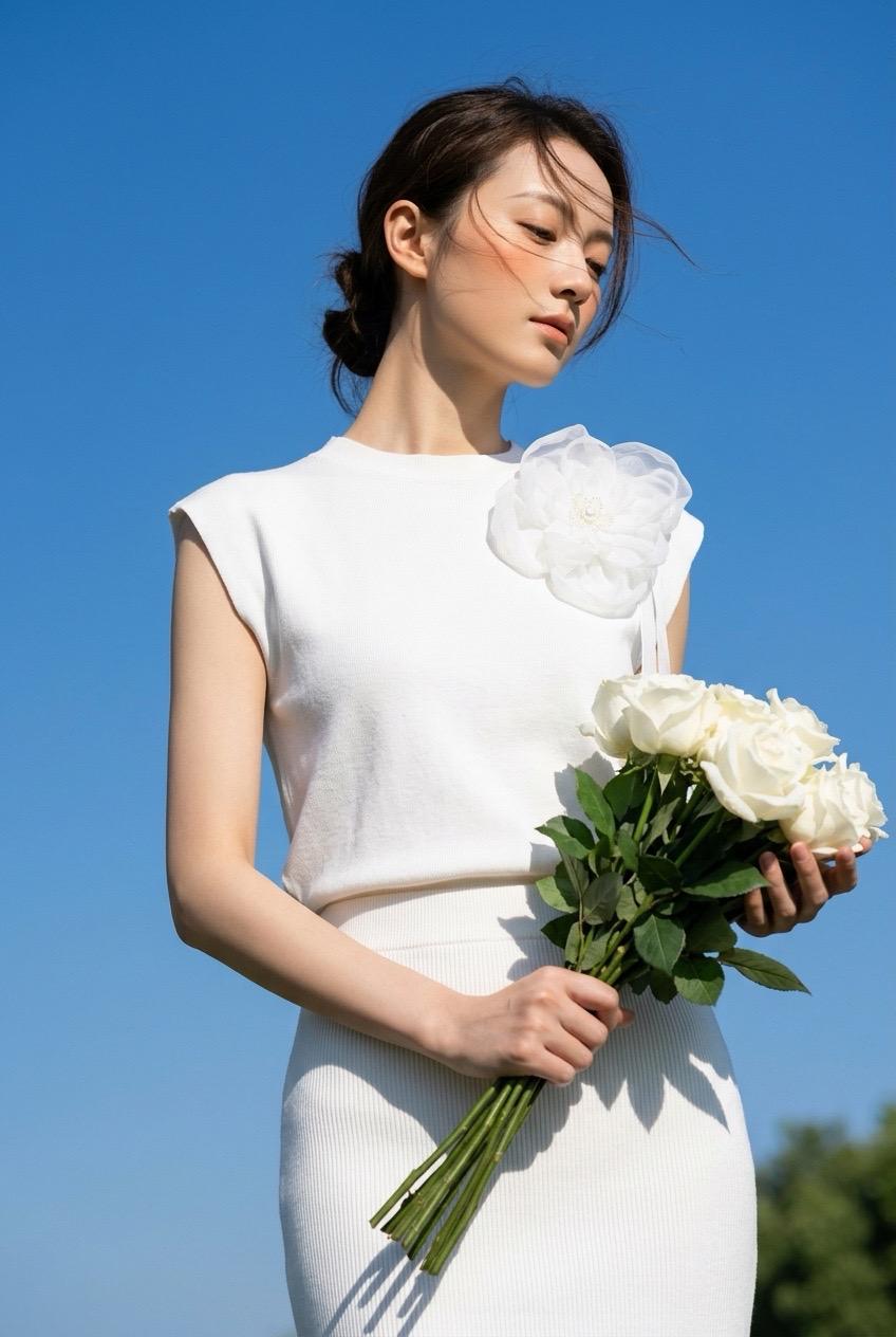 Dieses ärmellose weiße T-Shirt ist mit einer dekorativen schwarzen Blume verziert, die dem Kleidungsstück eine stilvolle und feminine Note verleiht. Die schwarze Blume setzt einen eleganten Akzent und macht das T-Shirt zu einem besonderen Blickfang. Der weiche, leichte Stoff sorgt für hohen Tragekomfort, besonders an warmen Tagen. Perfekt für einen modernen und eleganten Look, lässt sich dieses T-Shirt hervorragend mit Jeans, Röcken oder Shorts kombinieren.