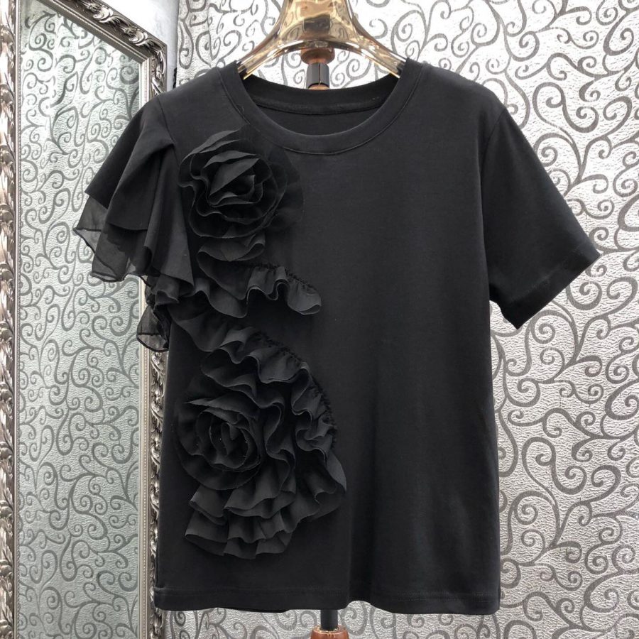 Dieses schwarze asymmetrische T-Shirt besticht durch seinen modernen Schnitt, der für eine interessante und einzigartige Silhouette sorgt. Der asymmetrische Designakzent verleiht dem T-Shirt eine stilvolle und trendige Ausstrahlung. Der weiche Stoff sorgt für angenehmen Tragekomfort, und das schlichte Design lässt sich vielseitig kombinieren. Ideal für einen lässigen Look, kann dieses T-Shirt perfekt mit Jeans, Röcken oder Shorts kombiniert werden.