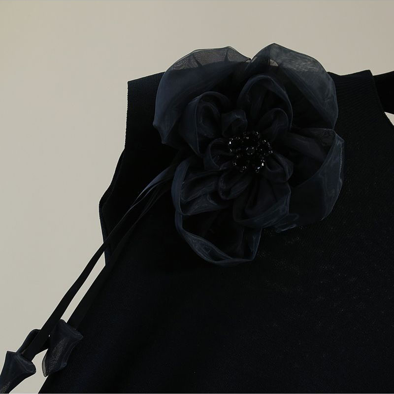Ärmellose Bluse aus schwarzem Strick, verziert mit einer Blume in der gleichen Farbe.