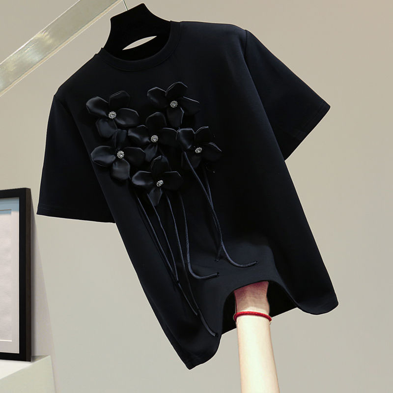 T-Shirt in Schwarz, verziert mit Blumenapplikationen.
