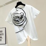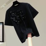 Dieses schwarze T-Shirt ist ein elegantes und stilvolles Kleidungsstück, das mit einer raffinierten schwarz-weißen Blumenapplikation aus Organza verziert ist. Das Design verleiht dem Outfit eine feine Note und besondere Weiblichkeit, wodurch das T-Shirt vielseitig für verschiedene Anlässe geeignet ist.