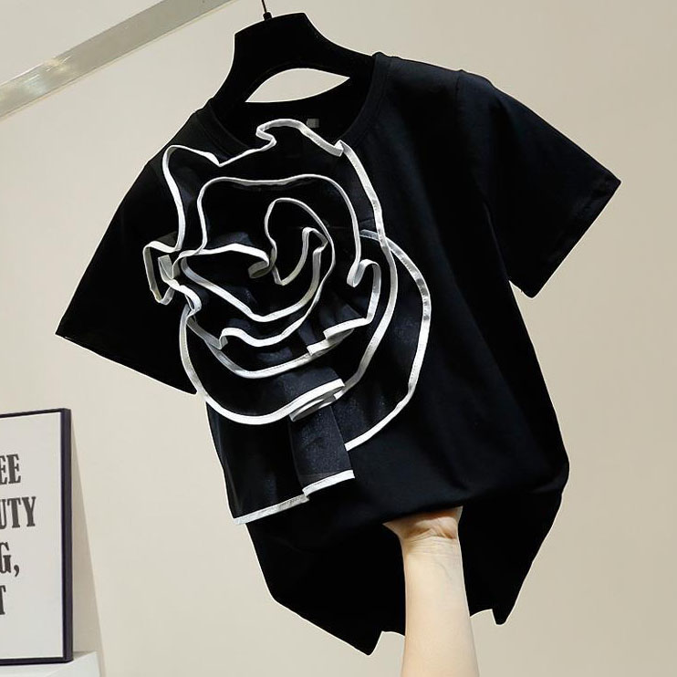 T-Shirt in Schwarz, verziert mit einer schwarz-weißen Blume aus Organza