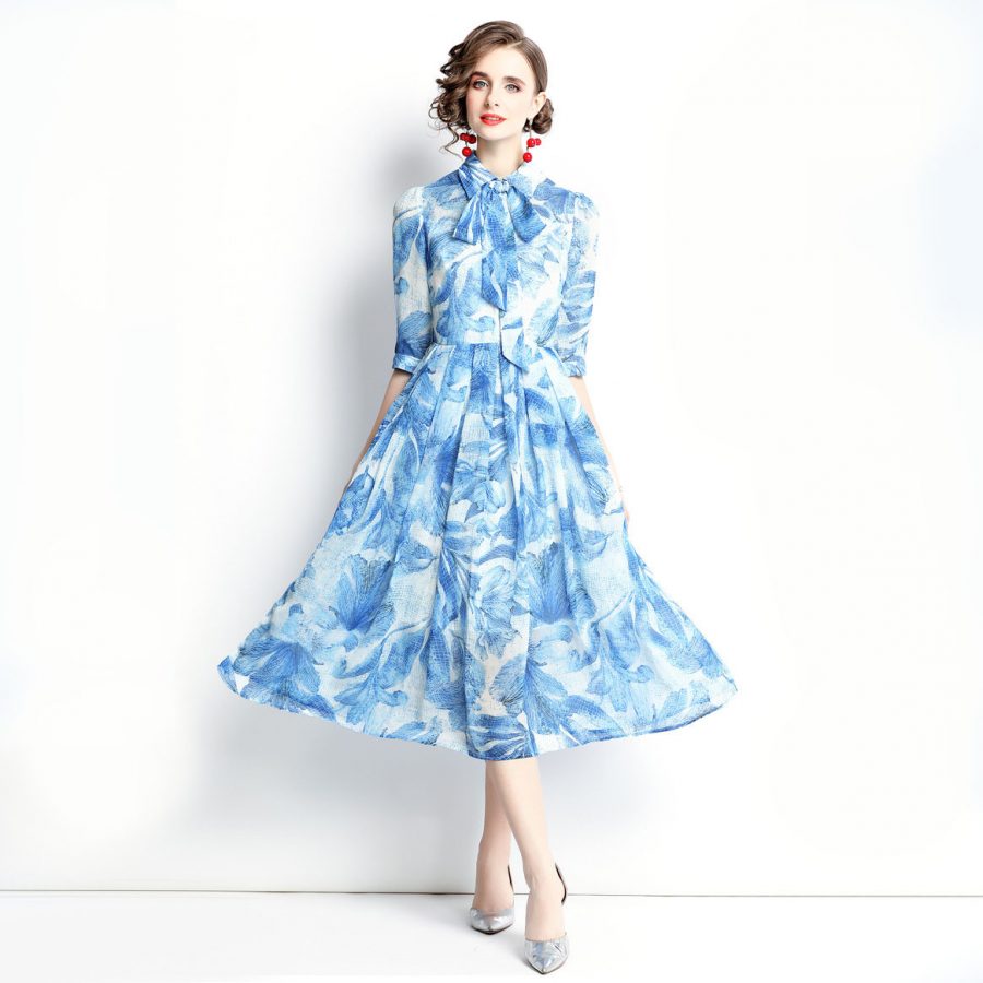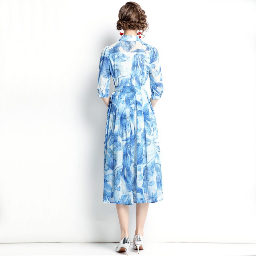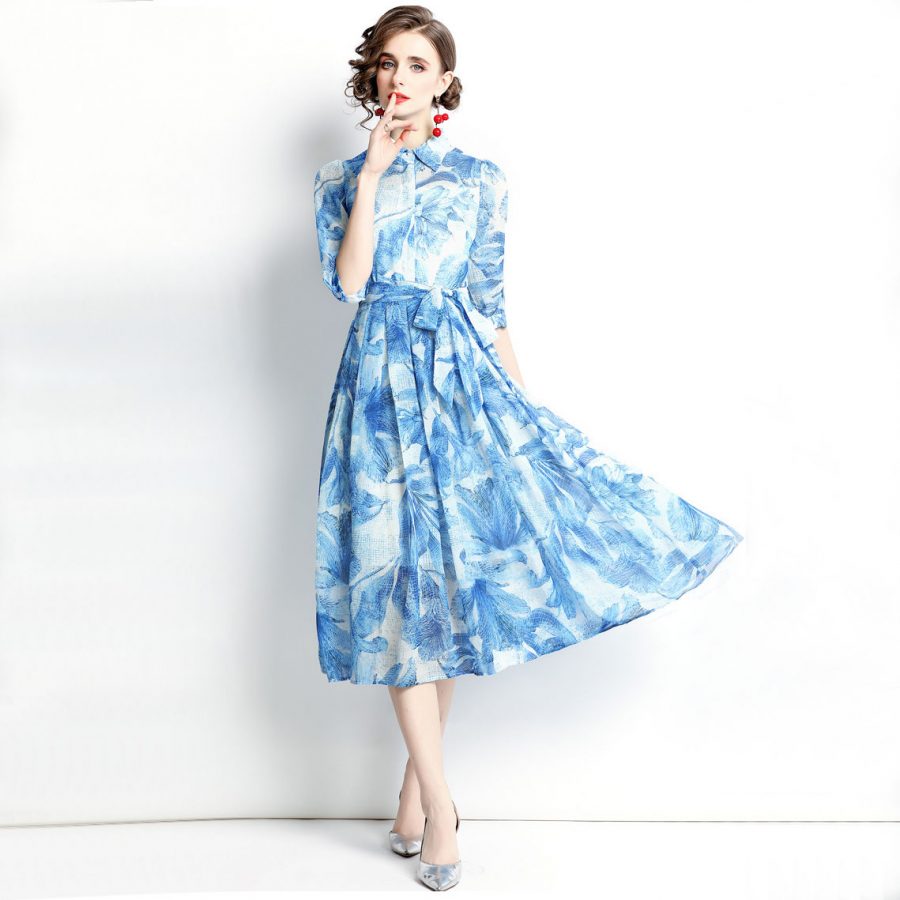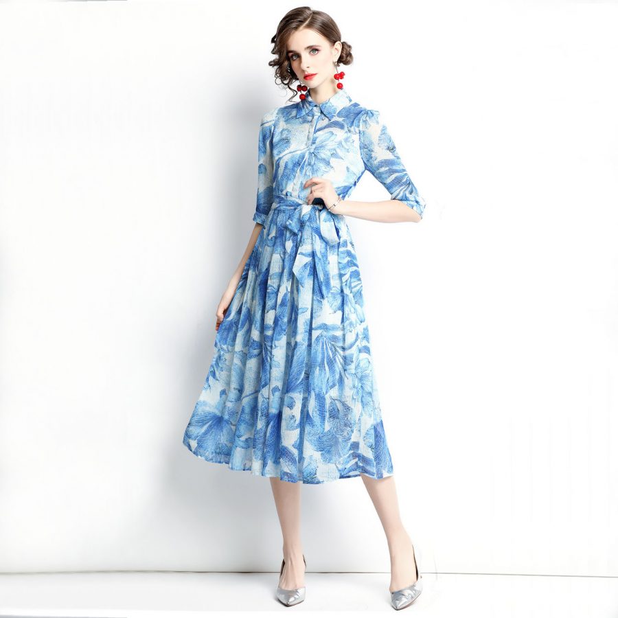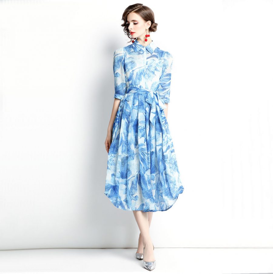 Dieses elegante Midi-Kleid aus Chiffon mit zartem weiß-blauen Print vereint Raffinesse und modernen Stil. Der obere Teil des Kleides ist im Hemdblusenstil gehalten, was dem Look Eleganz und Anmut verleiht. Der leichte Chiffon fällt sanft und fließend, wodurch eine luftige und romantische Silhouette entsteht. Dieses Kleid ist ideal, um einen frischen und eleganten Auftritt zu kreieren, der durch sein originelles Design und seine hohe Verarbeitungsqualität besticht.