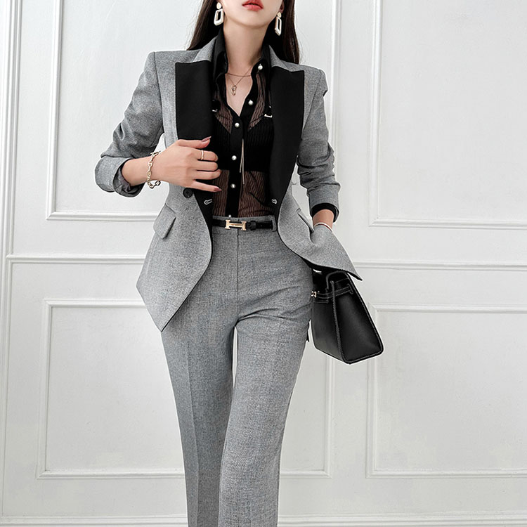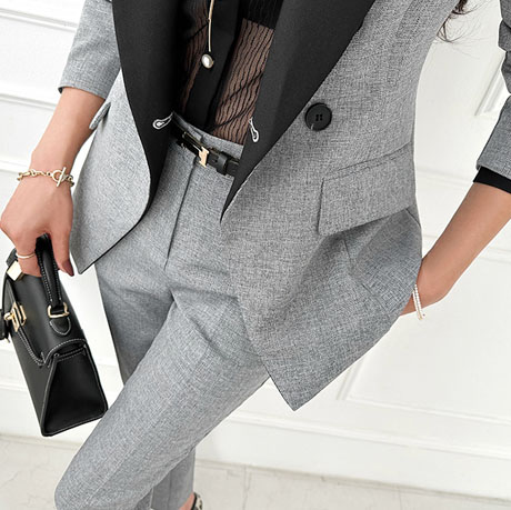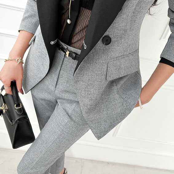 Dieser klassische graue Anzug besticht durch Eleganz und einen makellosen Stil. Das taillierte Sakko mit schwarzen Revers unterstreicht den erlesenen Geschmack und verleiht dem Look eine moderne Note. Die figurbetonten, leicht verkürzten Hosen fügen dem Outfit Dynamik und zeitgemäßen Chic hinzu.