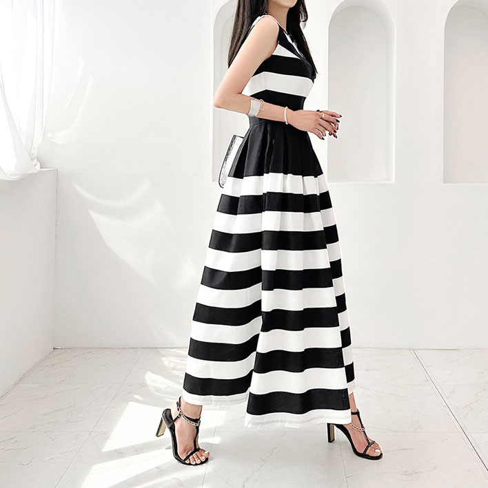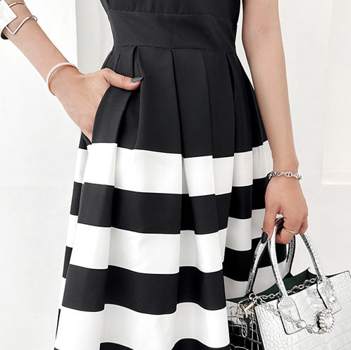 Das stilvolle, ärmellose Midikleid mit Schwarz-Weiß-Streifen ist die Verkörperung von Eleganz und modernem Design. Es betont perfekt die Figur und eignet sich sowohl für den Alltag als auch für besondere Anlässe. In diesem Kleid werden Sie immer elegant und modisch aussehen.