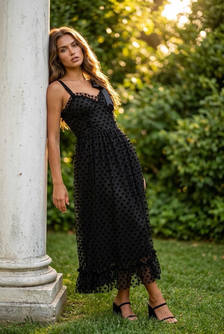 Dieses elegante Midi-Kleid mit breiten Trägern in Schwarz aus Tüll ist der Inbegriff von Raffinesse und Feinheit. Der leichte und luftige Tüll schafft einen romantischen Look und umhüllt die Figur mit einem Hauch von Geheimnis. Die breiten Träger verleihen dem Kleid Eleganz und sorgen für angenehmen Tragekomfort. Dieses Kleid ist perfekt für besondere Anlässe, bei denen Sie wirklich beeindruckend und stilvoll aussehen möchten.
