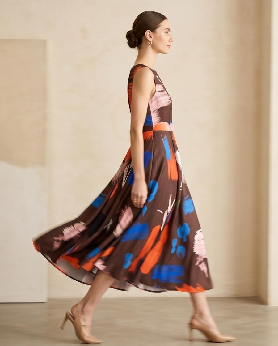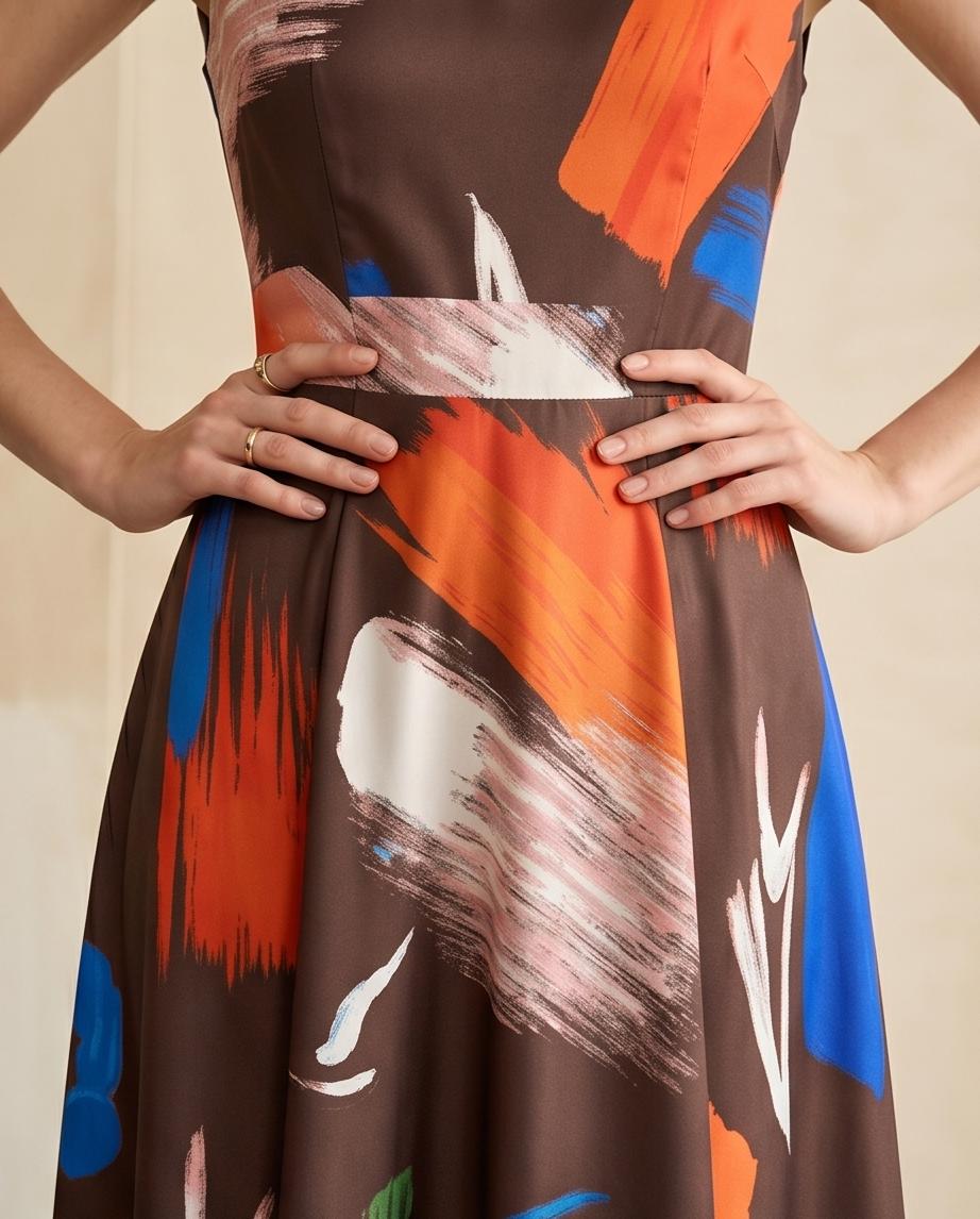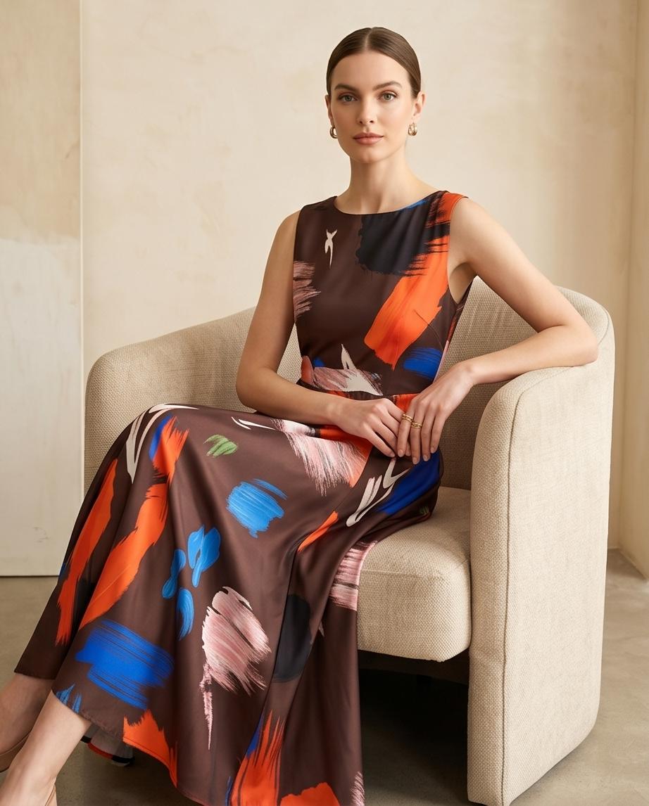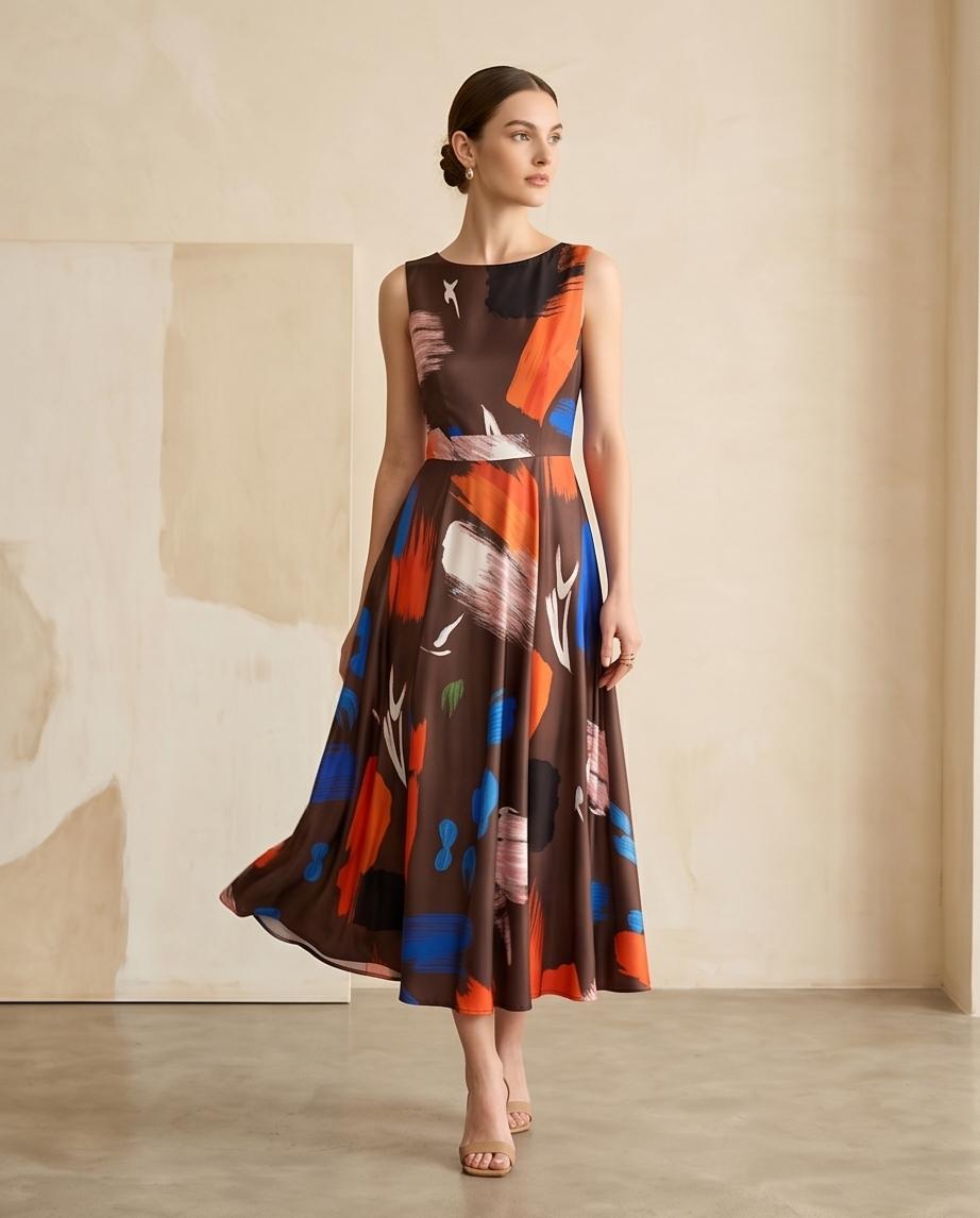 Elegantes Midikleid mit auffälligem Print und ärmellosem Design. Perfekt, um Ihren Stil und Ihre Raffinesse zu betonen.