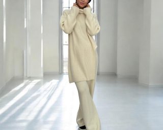 • Anzug Pullover beige mit weißen Einsätzen an den Ärmeln und schwarzen Hosen